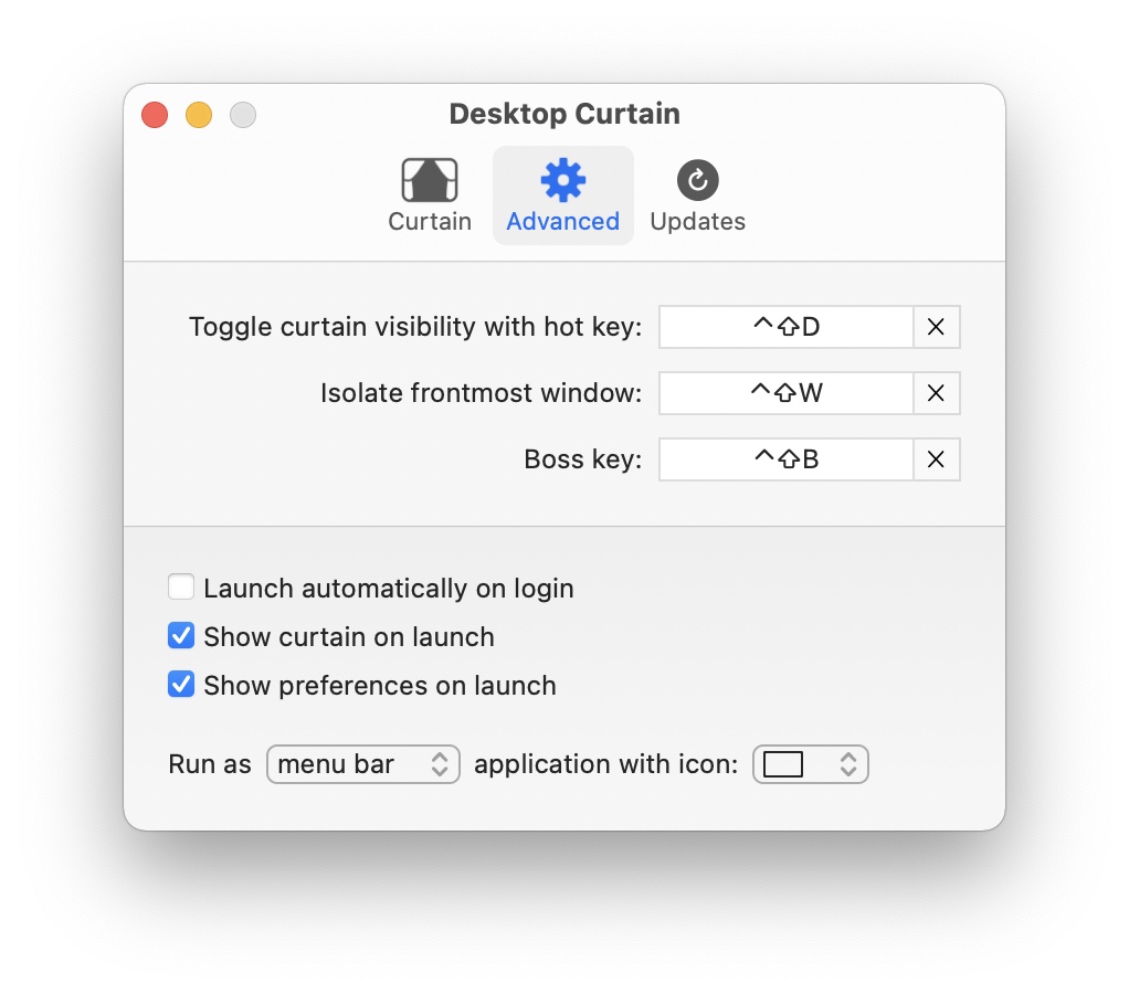 You can define global hot keys to toggle the curtain's visibility or to isolate the frontmost window, and setting Desktop Curtain launch at login (with its curtain optionally hidden) is as simple as checking a box.
